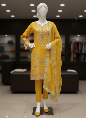 A graceful festive ensemble featuring delicate embroidery and a soft luminous chamki lawn base. Includes separate borders and embroidered sleeve patches for enhanced detailing.