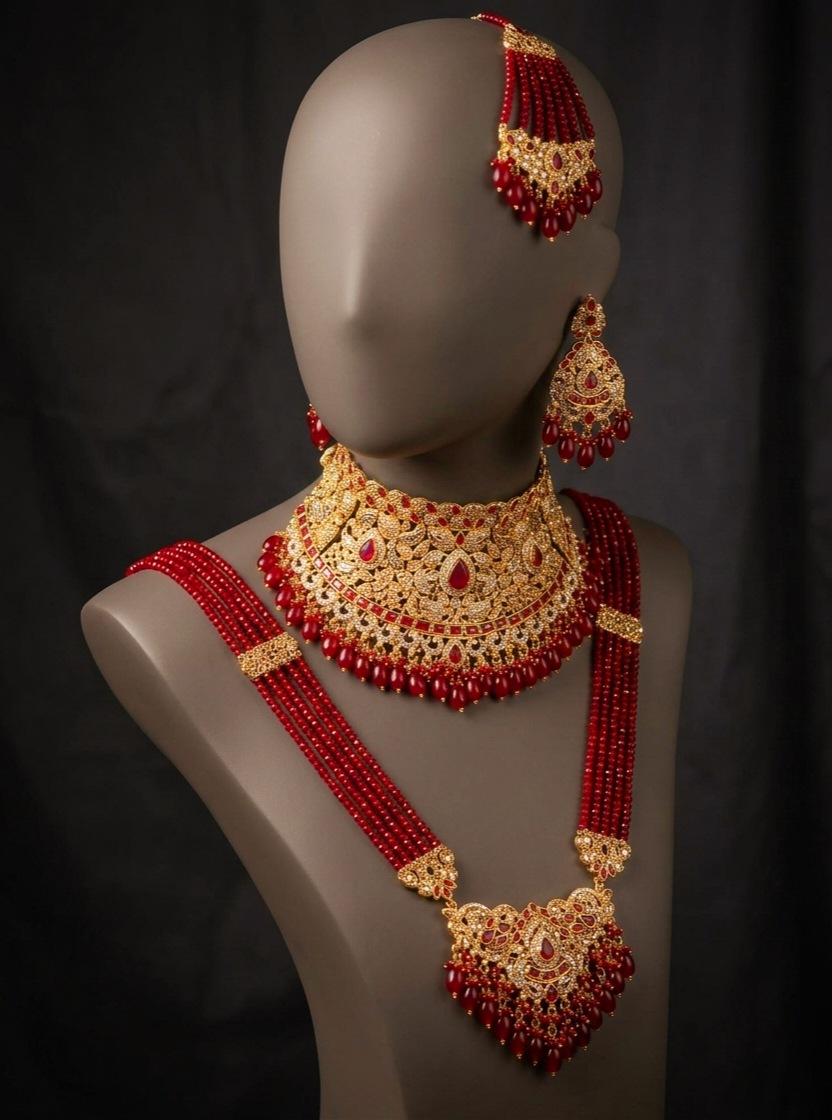 Al Nafees Collection offers a wide variety of Pakistani bridal sets that blend classic heritage designs with modern trends, ensuring every bride finds her dream jewelry. Whether you prefer traditional red and gold tones or contemporary shades, our heavy bridal sets are crafted to complement every bridal outfit perfectly.